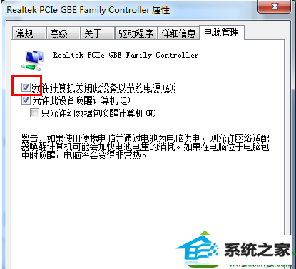 5、在“电源管理”选项中勾选“允许计算机关闭此设备以节约电源”选项,并按确定键;
