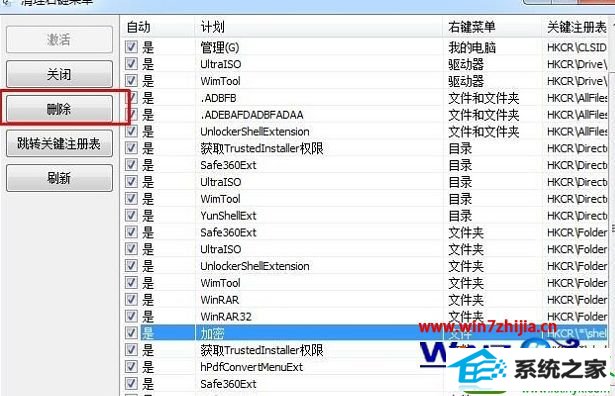 3、之后会打开“清理右键菜单”窗口,找到想要删除的“加密”选项,选择并点击左侧“删除”按钮即可。